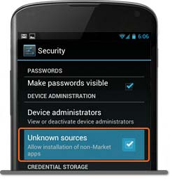 Navigate to your device's Settings, select Security or Applications (depending on device) and check the Unknown Sources box to allow the application to install.